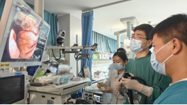 宁守斌教授率先操作,为一例黑斑息肉综合征患者实施小肠巨大息肉切除术,成功切除直径超过1cm的息肉30余枚,操作娴熟,过程精彩。他特别演示了如何在保证安全的前提下切除多枚息肉,并向学员们详细讲解了出血防控及术中技巧。